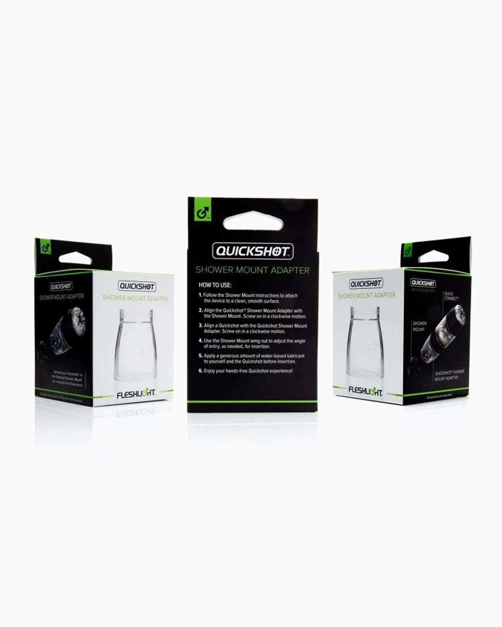 Using the Quickshot Shower Mount Adapter is straightforward and user-friendly. Begin by removing both caps from your Quickshot toy. Next, screw the Shower Mount Adapter onto the Quickshot, and then attach the Shower Mount to the adapter. This setup transforms your Quickshot into a stationary pleasure device that can be secured to any flat, stable surface, such as a shower wall or bathroom tile.